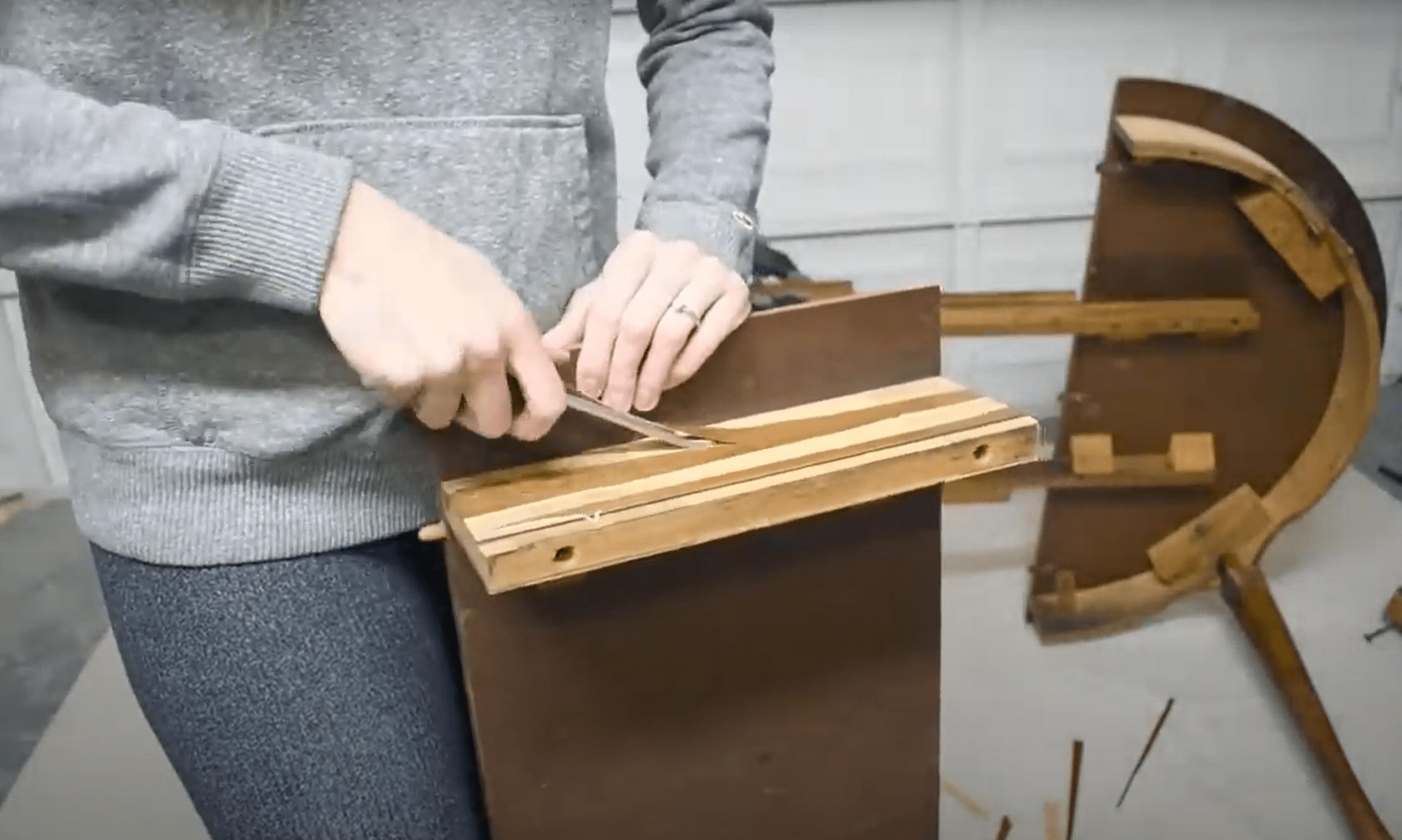 Next, I wanted to address the veneer on the sides. I could have left this, but mine was already quite chipped and peeling. Mine came off mostly easily as it wasn't very well adhered, but if you ever run into this issue and you're having a difficult time, you can also grab an iron and a damp cloth to heat up or seam off the glue that's holding this veneer in place. Then it should peel straight off. Also, fair warning, this stuff can be really sharp, so I would recommend wearing gloves and safety glasses, especially if yours is having a hard time coming off.