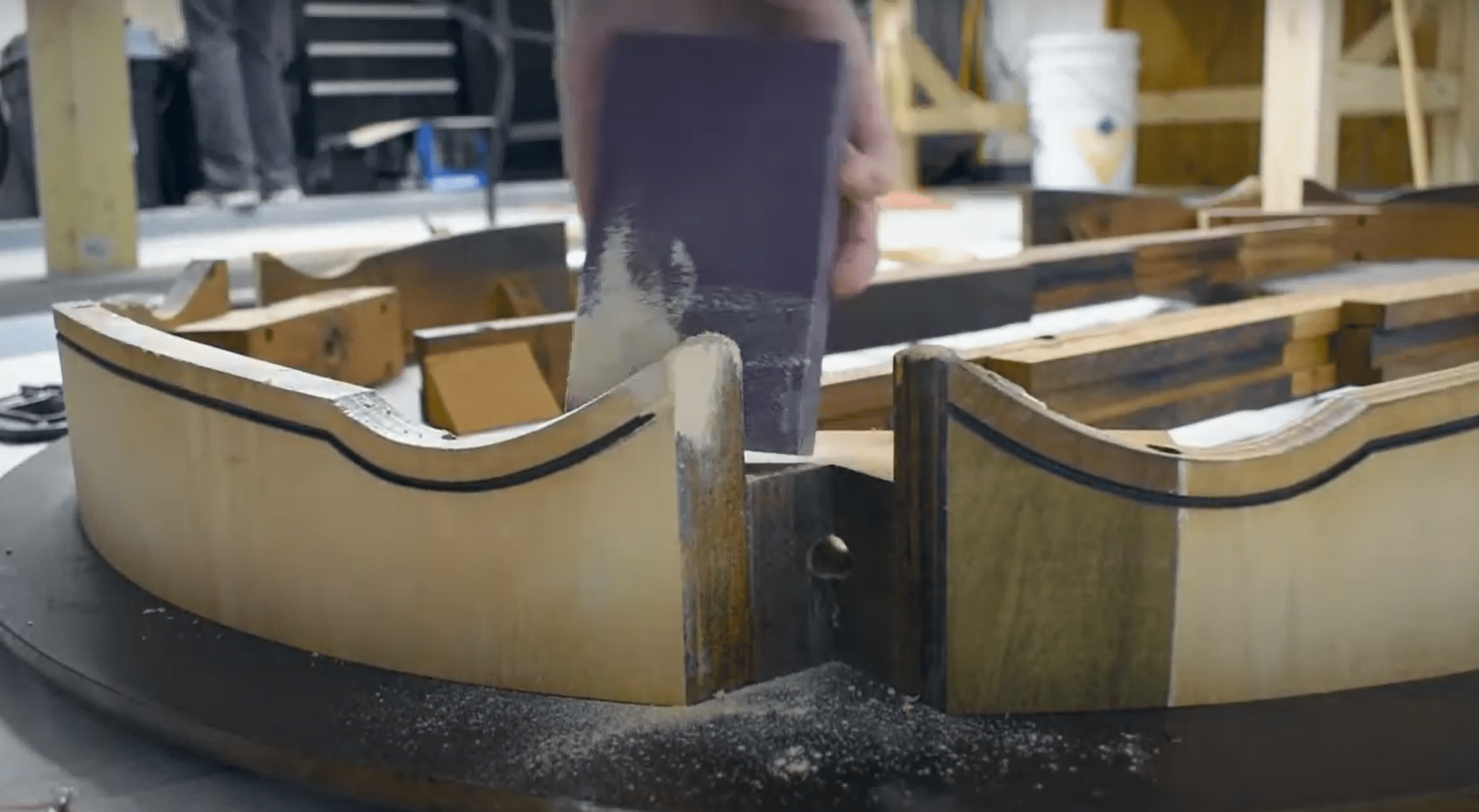 The veneer has a very thick and shiny top coat on it. So, what I was hoping to do was sand through this gloss and then use a wood stain to almost richen that top layer, and then seal it again with something a bit more matte. I had done this on one of the leaves with a brown stain, and it actually turned out quite well. Veneer is just a very thin piece of wood glued on top of, in this case, plywood, so it's important to be careful when you're sanding because you don't want to burn through that top layer that's showing the pretty grain.
