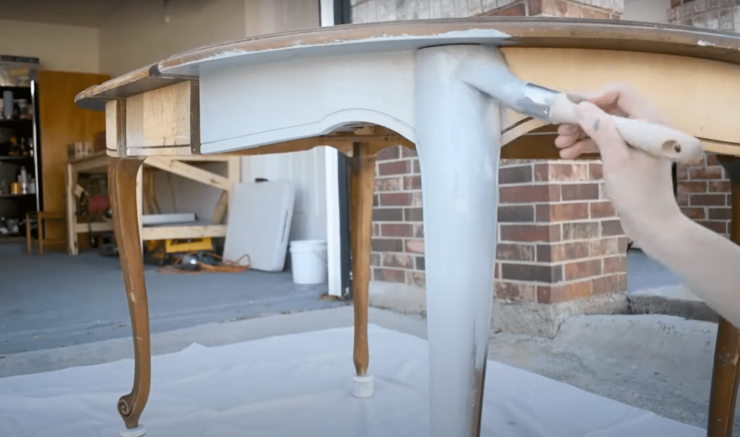 I applied two coats of this paint all around the bottom of the table, so the legs, the side skirts, as well as the underneath of the table top, and I waited at least an hour, probably closer to two, between layers. I am using my one-inch round brush by Zebra. I really like this one, and it worked well for this project. It's made for curves just like the legs on this table, but it was also small and nimble enough for me to get up into some of the cracks and crevices, so the underside of the table, for example. You definitely don't need fancy brushes to do any of this, but it is interesting to see the differences in how they apply paint and how quickly they make the work go for different tasks.