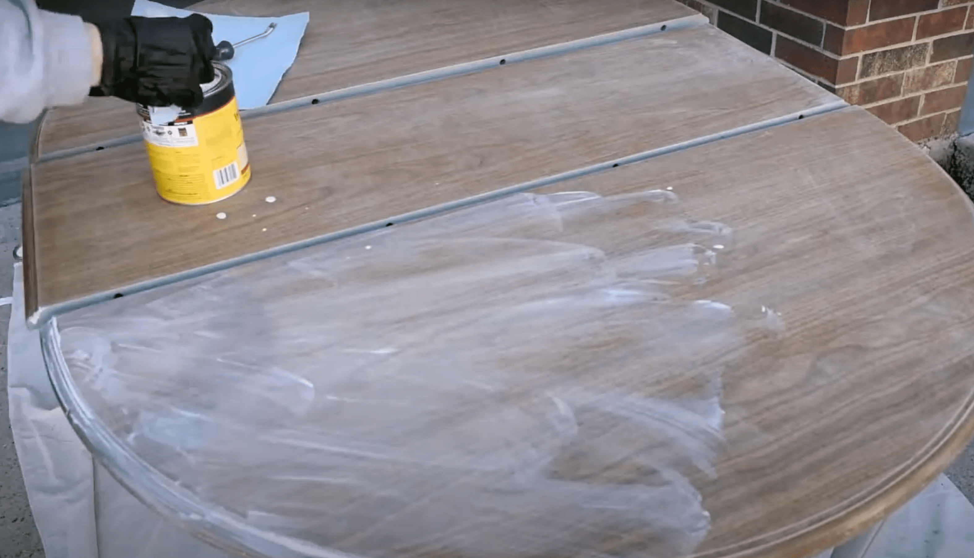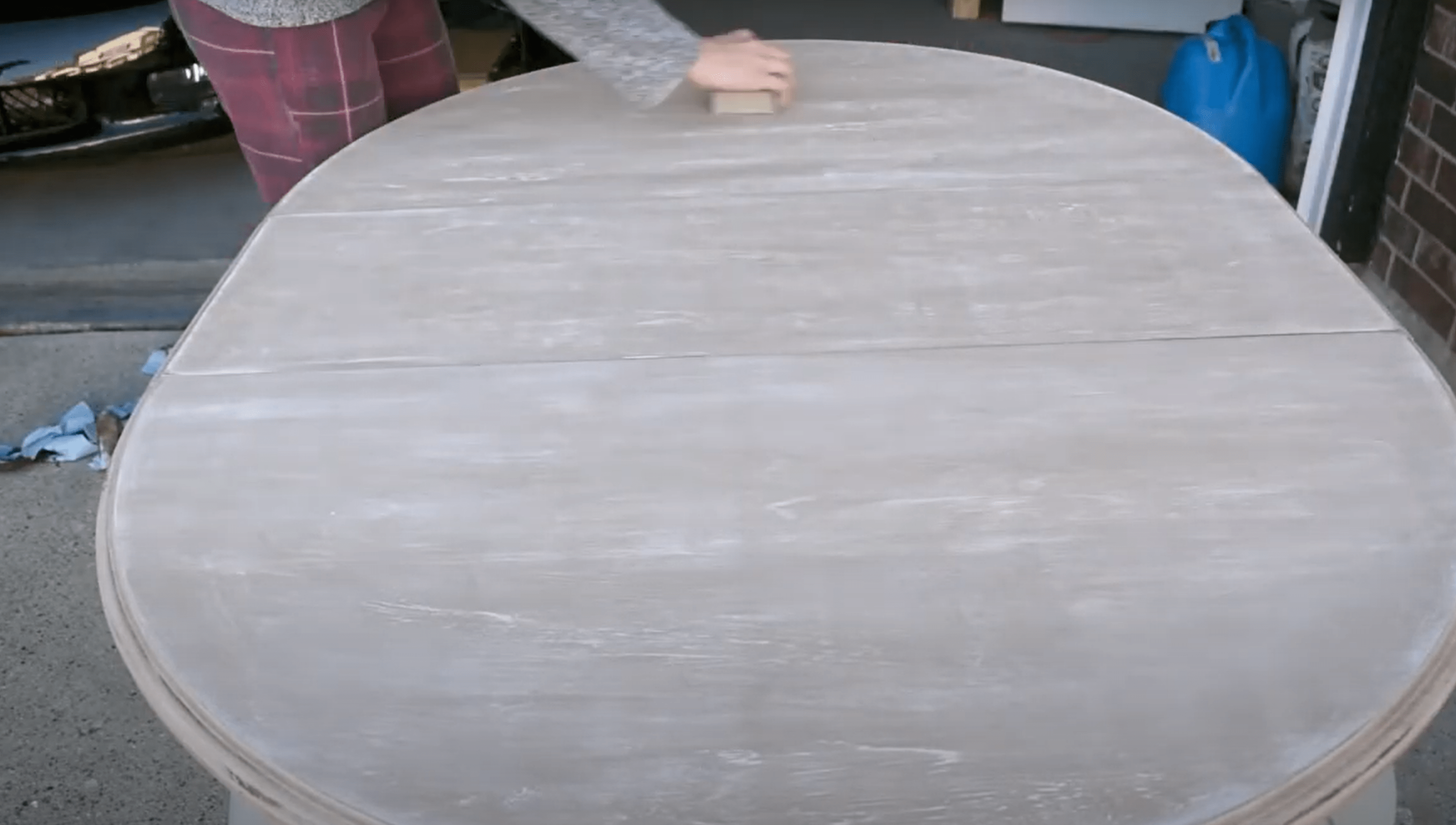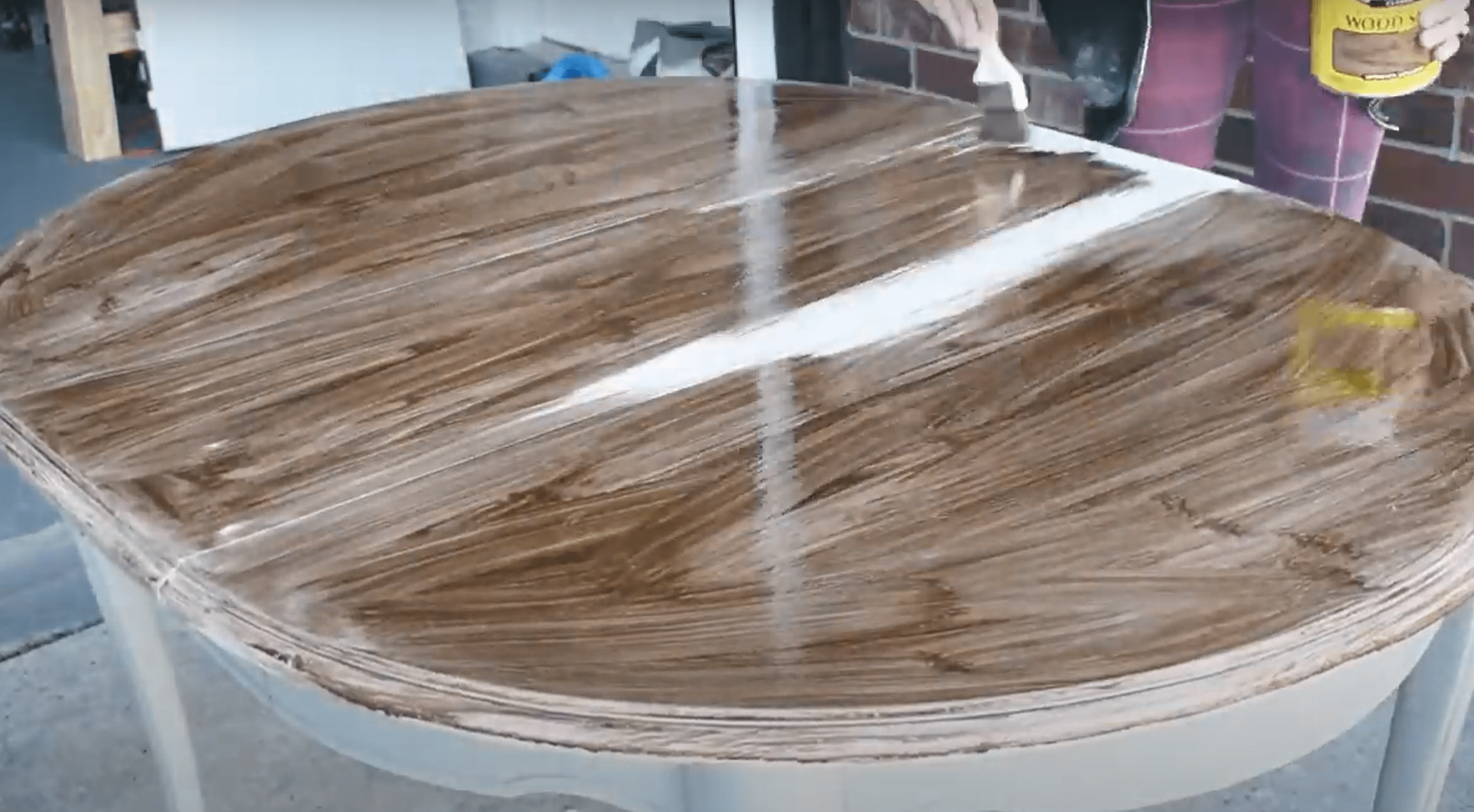 Once that was done, it was time to go back to the tabletop. Overnight, I had changed my mind and decided I wanted to try a white stain to create a white-washed look. Mistake number one was this just made the remaining topcoat look really cloudy. Mistake number two was letting the stain sit for too long and having it dry before I wiped it up. You can see when I get back to where I started it won't come up, so I tried to re-wet it with a bit more stain, but it was super messy, super streaky, plus the cloudiness of the white.
