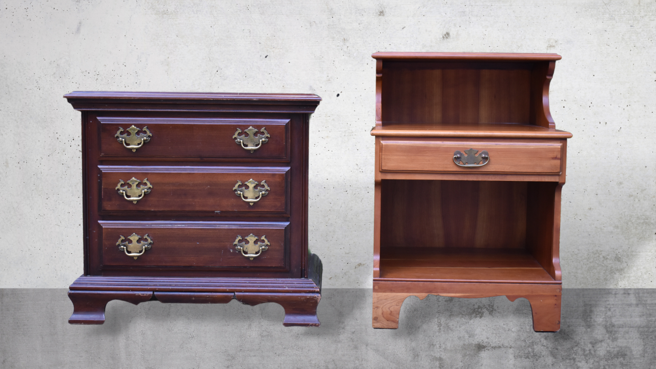 I have been looking to update my bedside tables for quite a while now, but I have not been willing to splurge on anything new. I found these two separately on Facebook Marketplace for thirty dollars and forty dollars each, and they're both made of solid wood, really well-made from notable brands.