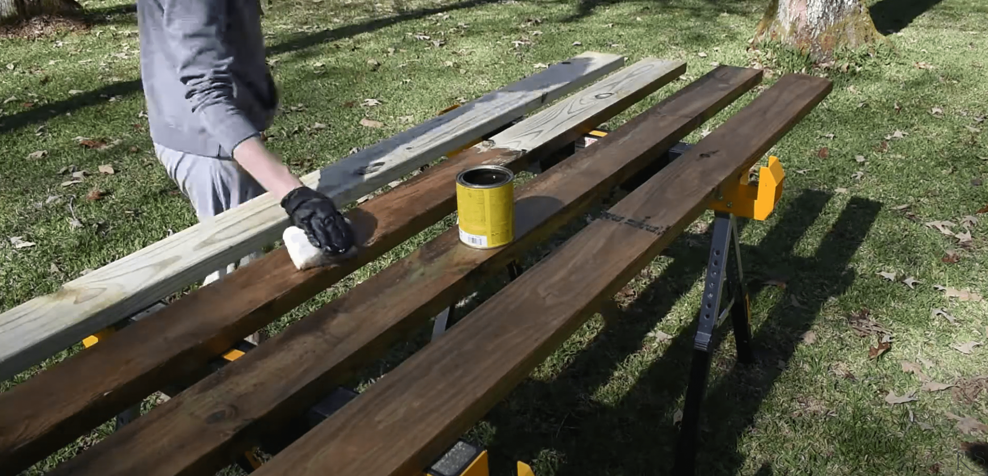I am using Early American by Varathane. I'm applying two coats on all sides with a neat little staining pad, and waiting about an hour between coats.